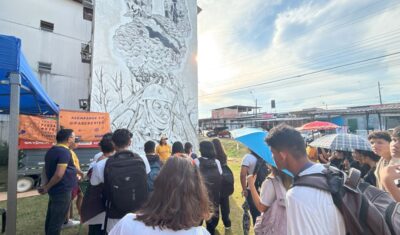 Mural pintado com restos da floresta ressignifica devastação por meio da...