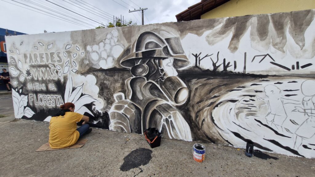 São quase 16h30 de uma quinta-feira, quando um menino aparentando ter não mais do que 12 ou 13 anos passa em frente ao muro que está sendo pintado e manda sem rodeios: “Agora está ficando legal, tio!”. Não se trata de um mural tradicional de grafite onde o colorido cria uma conexão imediata com a estética jovem e diversa, mas de uma obra que desafia artistas e público a ressignificar os diversos tons de cinza de uma mata queimada.