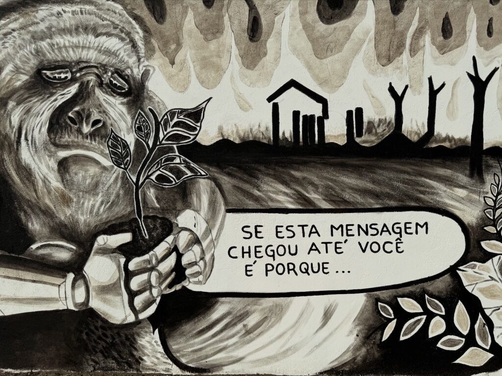 Mural ‘Piscografite’, do artista Denis L.D.O: as lutas pela vida representada pelo brigadista em meio ao fogo e pelo macaco que apontam para o fio de esperança representada pela muda de árvore. (Foto: Steffanie Schmidt)