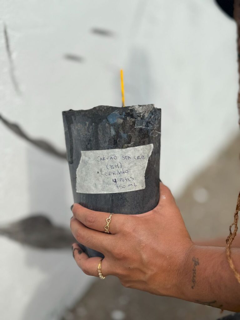 Na mistura com resina acrílica, as cinzas carregam traços do que foi perdido, mas, também, possibilidades de memória e reconstrução.