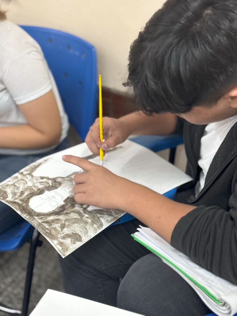 A oficina contou com a exibição do curta “Cinzas da Floresta”, relatando o processo de nascimento do projeto e da fabricação das cinzas, seguida de palestra e tira-dúvidas sobre o trabalho de brigadista e sobre a pintura com as tintas da mata. Atento a todos os movimentos, Arlysson Gabriel retratou uma árvore em chamas em seu desenho.