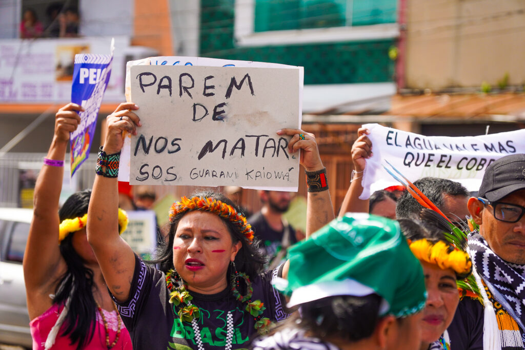 A marcha também denunciou a continuidade da violência contra povos indígenas, mesmo durante a COP30. No domingo (16), um jovem Guarani-Kaiowá foi assassinado no Mato Grosso do Sul, vítima de conflitos por territórios.