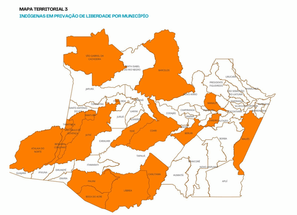 Atualmente, as pessoas indígenas privadas de liberdade estão concentradas em 18 municípios dos 62 existentes no Estado. As Unidades Prisionais de Tabatinga, Tefé, Coari e Maués, têm, juntas, 34 pessoas indígenas em suas celas. Em relação à distribuição de pessoas indígenas nos estabelecimentos de privação de liberdade, 69 estão em delegacias do interior do Estado, 67 em Unidades Prisionais – sendo 33 nas unidades da capital e 34 em unidades do interior.