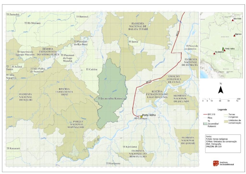 A TI Jacareúba-Katawixi é hoje pressionada por três frentes que remodelam a Amazônia meridional: a BR-319, as hidrelétricas de Santo Antônio e Jirau e o avanço da grilagem. A BR-319 deixou de ser apenas estrada e se tornou vetor de ocupação. Onde ela chega, surgem ramais; onde surgem ramais, instalam-se serrarias; onde serrarias se consolidam, a floresta cai e, com ela, desaparecem os corredores que permitem que povos isolados evitem o contato forçado.