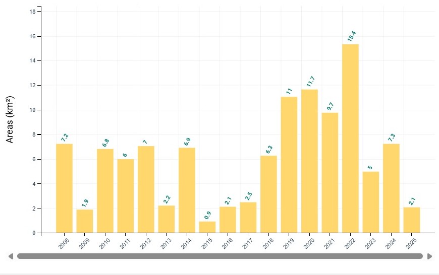 Dados sobre o desmatamento da Amazônia em Jordão. Pico aconteceu entre 2019 e 2022 (Fonte: Prodes/Inpe)